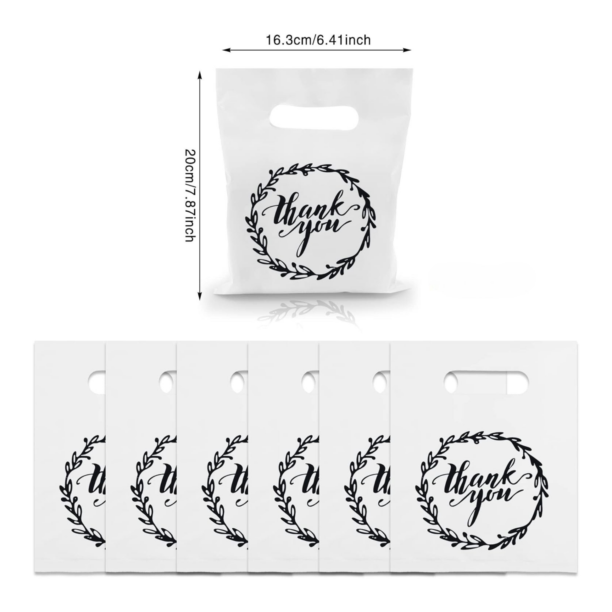 Make a lasting impression with these stylish 6x8-inches thank you bags, perfect for retail, boutiques, and special events. Featuring a white background with a stylish black "Thank You" wreath design, these durable plastic bags add a touch of charm and professionalism to any purchase or gift.